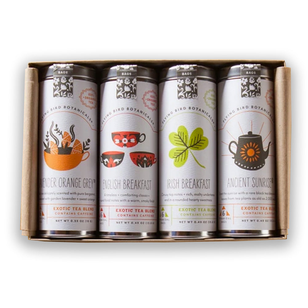 Can't decide which tea to go with? Wake up to four choices of Flying Bird Botanical teas. Pair with any of our Bumbleberry Farms honeys for a truly sweet morning. Each tin is filled with six perfectly portioned silken biodegradable pyramidal tea bags. Includes: